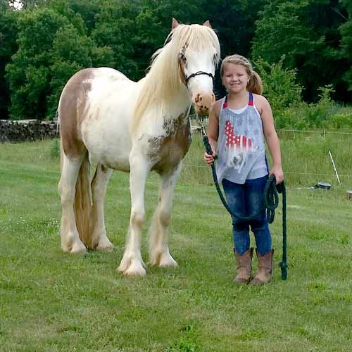 Brenlee started loving horses at 4 years old so we got her a mini pony and taught her to ride. We took her to columbus every year to the equine affaire and she fell in love with gypsies. She would go on and on and dream of having her own gypsy she'd color them in coloring books look them up on you tube. She loves them. We kept teaching her how to ride she started riding bigger horses and showing some and she always brings home a blue ribbon and everyone is always so amazed of how good such a young girl can ride.