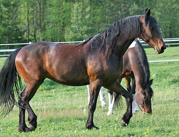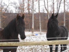 Flying W Farms Prince Volkomen Von Leven IGGHR#238 aka Vennoot or Vernoot Friesian Georgian Grande The other horse is Marge's purebred Friesian gelding. Can you tell which is which? |
