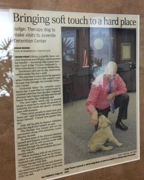 I wanted to take the time to update you on our Therapy Dog that you so graciously donated to the Court. Moxie is now 4 years old and doing well. Moxie became a certified therapy dog and has assisted as comfort for a child when he testified about sexual abuse that he had endured, she visits children that are locked up in our detention center daily, and will be assisting a child who was accused of Murdering her own mother at a hearing this coming Monday. Recently, one of our workers suffered an injury to her foot and over the course of a number of days Moxie would see her and keenly sensed the injury and provided extreme comfort to that employee. The employee was so moved by the experience of Moxies keen senses, gentleness, and love that she went out of her way to let me know the great benefit Moxie is to our organization of over 200 employees. In addition to these few stories that come to mind, Moxie makes public appearances at locations where children that are in the system gather as well as takes part in our annual adoption day where 40-50 children get adopted.