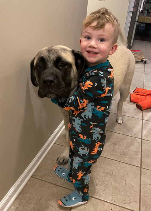I cannot express to you what this dog means to our family. As I had explained when we picked her up in October, I was not a dog person. My husband was the one who loves dogs. She has quickly changed my mind and I cannot imagine living life without an American Mastiff. Her name is the first thing said each morning after my toddler wakes up and then the two are inseparable. It is nearly impossible to get a photo of her without him. People cross the stores to come and visit her because she is so beautiful and has such a great personality. I have joined a Facebook page for American Mastiff owners and you and a breeder in Deep Woods seem to be the most highly regarded. I never thought checking that page would be one of the highlights of my day but being her mom is so wonderful. We cannot thank you enough and my husband and I have discussed getting another one from you at some point before Minnie gets too old to hang around a puppy. She is very loved!