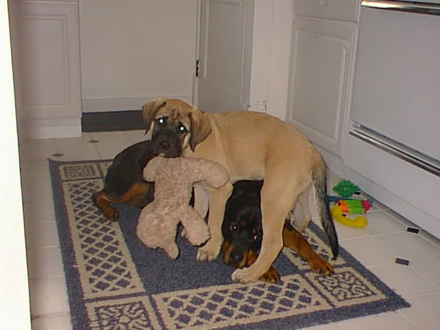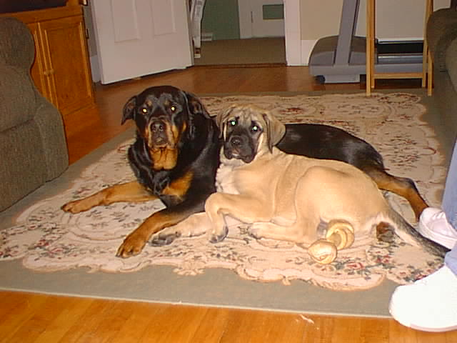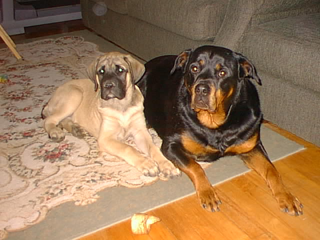 Wagner Fredricka, Well we have had our adorable little Angus for six weeks now and he is great!!! As promised there are pictures attached. He is 40 lbs. but as you know by the time you receive this e mail probably more!! As you can tell by the pictures our Rottweiler Gauge and Angus are the best of buds. Gauge pretty much lets Angus do as he pleases !! At 12 weeks and 40 lbs. how does that compare to your notes?? He is smart, adorable, and has a great personality!! Thank you so much for everything!! I look forward to hearing from you!! I will keep in touch with pictures etc. Thanks Again, J.R