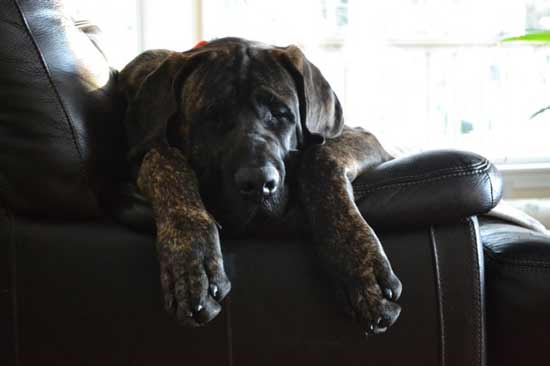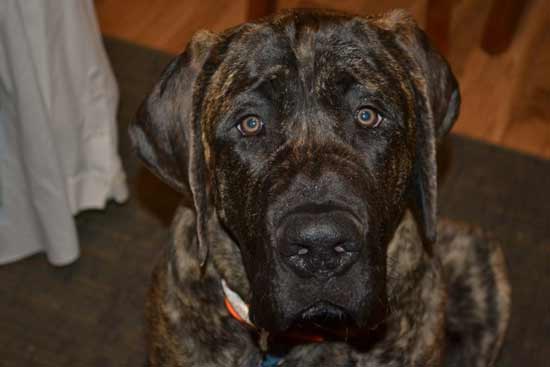 Just an update an Angus, our beloved. He now weighs 140 lbs and is such a gentle handsome and intelligent being. He tolerates having his nails painted by my daughters and does his best to pull them on the zip line. His only bad habit is destroying things (like visitor's shoes and coats if not secured in a high enough location). He has destroyed quite a bit of trim in his own room and in the house but I have managed to keep it minimal with bitter apple spray. We've resorted to a special box for visitors' shoes and belongings. We gently say "no" as we take away the undesired chew toy and replace it with one of his many nylabones or water bottle critters.