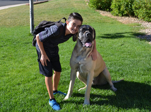 I've attached a few pictures mom took this morning with me and Justin on the first day of school. Justin is now 11 years old and started 6th grade today. He is growing up so fast. I love that kid so much! I walk him to school in the mornings. AND, I'm the mascot for his football team (the Mastiffs) and his baseball team (the Giants). I've been doing that since I was a puppy. I love it. I get to go to practices and games and they include me in the team photos. Everywhere I go people know my name.