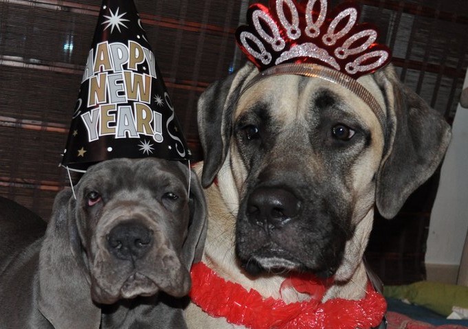 celebrate the new year with Ella and Kosmo, putting the hat and