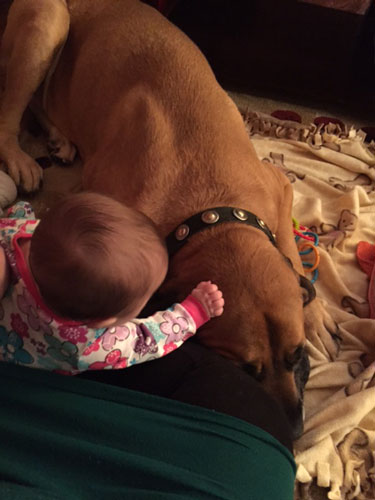 Good evening! This is Mark & Katrina and we hope this finds you all well. We Welcomed Flex from Flying W Farms into our family about 5 years ago. He has been such an amazing edition to our family and is indeed the neighborhood Gentle Giant. Flex has been wonderful to come home to each day and very friendly with people. He has just recently become a big brother to our first Daughter Mikayla in August. If any parents with kids already, or expecting parents wonder, let's be the first to say how great Flex has been with her! We made sure to bring home some baby clothes with her smell on it before we brought Mikayla home and Flex gave them a few good smells and that was all he wanted to know. He already knew :-) It was amazing to see how gentle and protective of her he was when she first arrived home and took it in stride. Went from sleeping on his twin mattress in our room, to right by the rocker next to Katrina. When we transitioned Mikayla over to her own room, Flex made a move too. He now sleeps out in the hall right in front of her room at the stairs also making sure he has enough view into our room jussst making sure he's got us all covered. Flex is also pretty slick when folks come over. He comes and gets his pets and belly rubs like always and then circles around like a (very large) ninja to slide himself in between whoever is holding Mikayla and anyone else standing near her with tail wagging away and getting more pets. No mistake he's also making sure to keep Mikayla safe :-) Thank you so very much for bringing this blessing into our lives! We love Flex so much and are grateful for you at Flying W Farms!