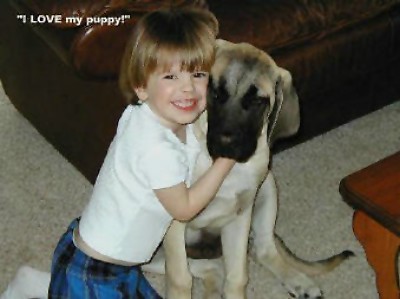 March 28, 2004 Hi Fredericka, I just took these pictures outside with Foster. I got one with his favorite ball I was telling you about. You didn't tell me if you still had a waiting list for your puppies? I see you have so many new pictures on your site, it's great to see all your dogs. My girls love to look at the other American Mastiffs people have. Again let me know how long that list is and perhaps we can be new owners of another American mastiff in our family? Thanks, Kelly