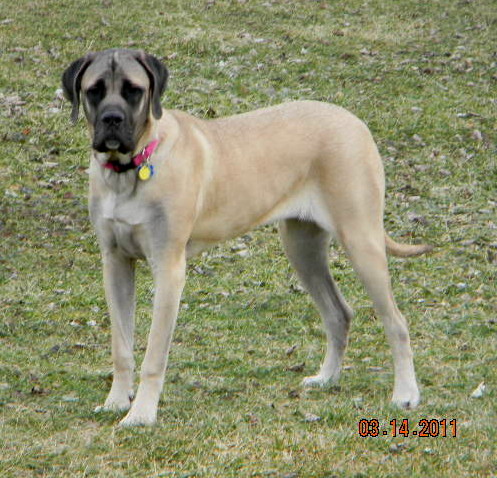 one year and almost seven months now and almost 150lbs. Our vet