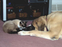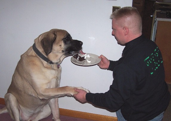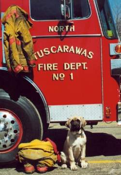 Hi Fredericka, Marcus is incredible. He is exceptionally well behaved at the Fire Department and is a perfect companion. At sixteen weeks he is 60 pounds. He has mastered sit, shake, stay, lay down, and crawl not only with verbal requests, but hand signals as well. Everyone is so impressed that at this young age I can tell him to stay, I can leave his sight, start a fire truck, come back into the office and he has not budged! I tell everybody he is just that smart, it's not me. Anyway, here are the pictures that I promised. There are six total that turned out really well. I figured you could take your pick if you decided to use one or more on the website. (I hope you do!) If you do please let me know so that I can have some friends check out my famous baby. He is truly a blessing. Pictures were taken with Engine 401 and Rescue 4 at Tuscarawas Township Fire Department. Thank you for everything! Chris From: "Chris" To: flyingw@bright.net Sent: Thursday, August 08, 2002 6:03 PM Subject: Marcus Aurelius at 8 months Hi Fredericka, Marcus is doing quite well. I have only had one problem with him chewing, but I have to take partial responsibly for that. I shut both of his chew bones in my bedroom. Here are a couple new pictures of the baby in, what he thinks is, "his" car. It is amazing to walk him and have people comment on what a big dog he is and then to see their expressions when I tell them he is still a puppy. I am personally amazed at his level of concern for me. Marcus LOVES to be wet, play in the hose, and take showers. I thought, with his apparent love of water that he would enjoy a baby pool to lay in when the weather is hot and we play in the yard. I later found out that he is terrified of having his feet covered with water. With his apprehension, the next time I showered him I flipped the latch and let the tub begin to fill. With a little over an inch in the tub he started to shake and was hustling to get out of the tub. I let the water drain and he was having fun again. Well a week later I took him to a local swimming pool. He had been there before, but he has never been allowed close to the water, health reasons, but has been great about sitting next to our stuff and I have had several friends to help keep an eye on him. I was getting ready for a scuba trip and wanted to get my weight right with my new wet suit. As I was playing around on the surface he was fine and sat there. When I went under my friend said he looked at the pool funny, cocked he head sideways for a moment, then came running in after me! Thank god he can swim, he does not like it, but he can swim. He popped to the surface and I was instantly under him to help him out.Needless to say I have not gone under water while he is around and as long as he can see me he is perfectly content to sit in the grass and get love from me and my friends. I have actually considered getting him a sister, but that would also require a lager house. Possibly in the future. :) Enjoy the pictures and if you want to add them to the fire truck pictures that is fine. I hope all is well with you. Chris