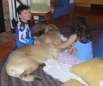 Jack decided that he wanted to take Tulip to show and tell on Wednesday. I asked the teacher and she said it would be fine and Tulip continues to amaze me as to what she knows. When we got to the classroom the kids where sitting in a half circle. She immediately went to the circle and laid right at the kids knees. She then spent a half hour laying motionless, allowing all the children to pet and climb on her!!!!!!Fredericka, I really think she knew what she was there for and understood how she was to act. Jack is in the blue long sleeve to shirt and Claire is in the pink sweatshirt. Tulip is in the tan bodysuite. John |