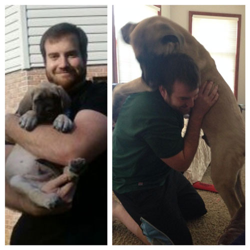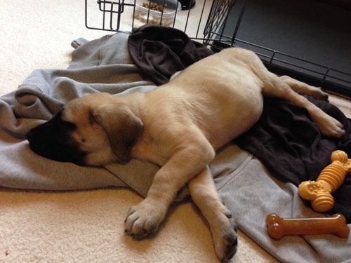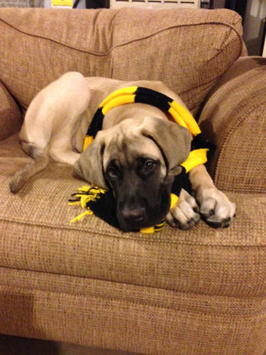 I just wanted to touch base and give you an update on him. He is growing like crazy! We started training classes last month, and he is doing great. He loves socializing with the other dogs and knows all the "puppy level" commands after just 3 classes. The trainer said he is one of the happiest/most outgoing mastiffs he has ever seen! Zeus is a little over 5 months now (August 25, 2013 birthday) and has to be somewhere between 85-100 lbs. I have not had a chance to weigh him recently, but he is a big boy.