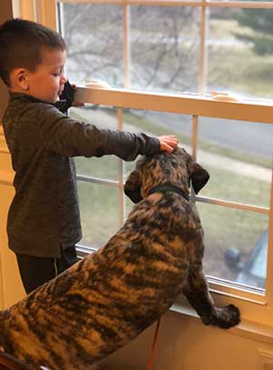 I just wanted to send an email to give you an update on Winston, the puppy that we adopted Jan 30th of this year. He is such a wonderful dog. He has a lot of energy and loves to go on walks with my two boys. And, every morning, as soon as he wakes up, he smothers my 4 year old with puppy kisses. Watching the two of them play is so heartwarming! Winston sometimes has trouble relaxing. It only because he hates to miss anything. So, no matter what we’re doing, he’s always with us. He is such a perfect addition to our family and we couldn’t be happier!